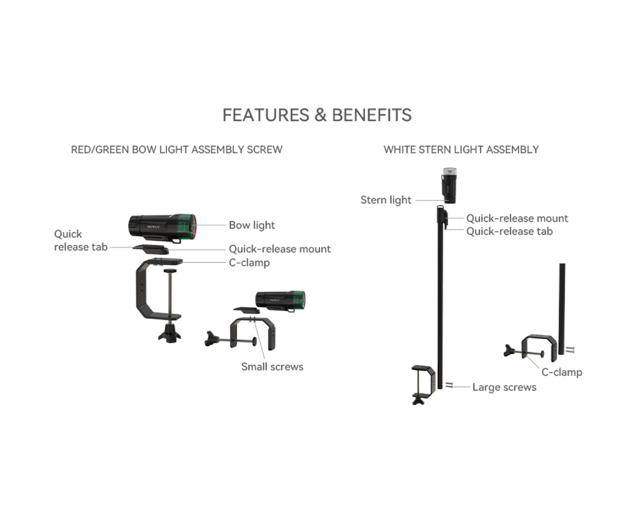 LED Portable Navigation Light Kit je kompaktno i prijenosno LED svjetlo namijenjeno za navigaciju na vodi. Dizajnirano je tako da se lako montira pomoću C-stezaljke (C-clamp), što znači da ga možete brzo postaviti i ukloniti bez trajne instalacije.