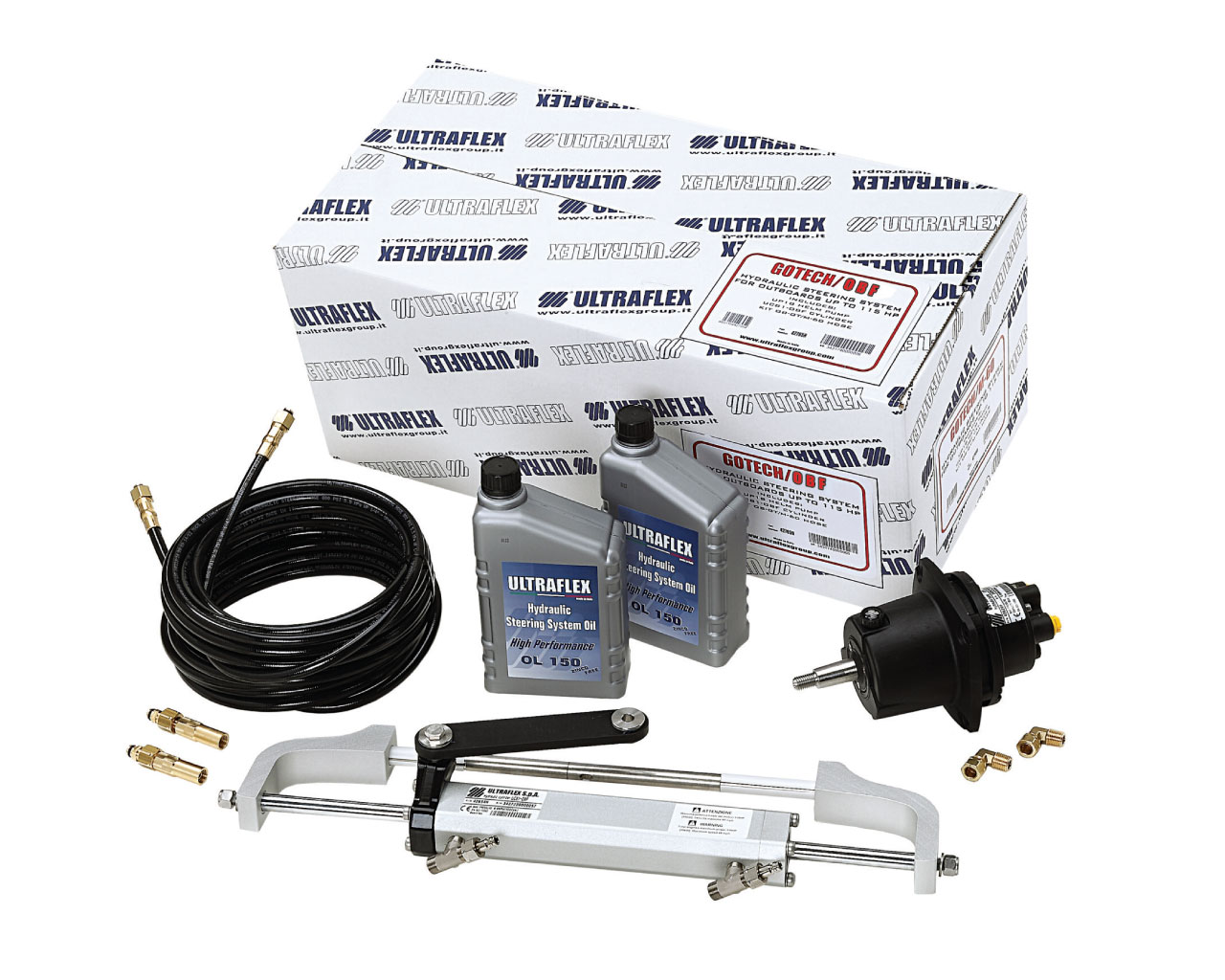 Za vanbrodske motore do 115HP. U kompletu dođu pumpa UP18, cilindar UC81-OBF, dvije litre ulja za hidrauliku te crijeva(KIT OB-GT/M-60) promjera 1/4’’ i dužine 6m sa priključcima na jednom kraju, a drugi kraj crijeva se reže na željenu dužinu i stavljaju priključci. Broj okretaja volana 4,5.