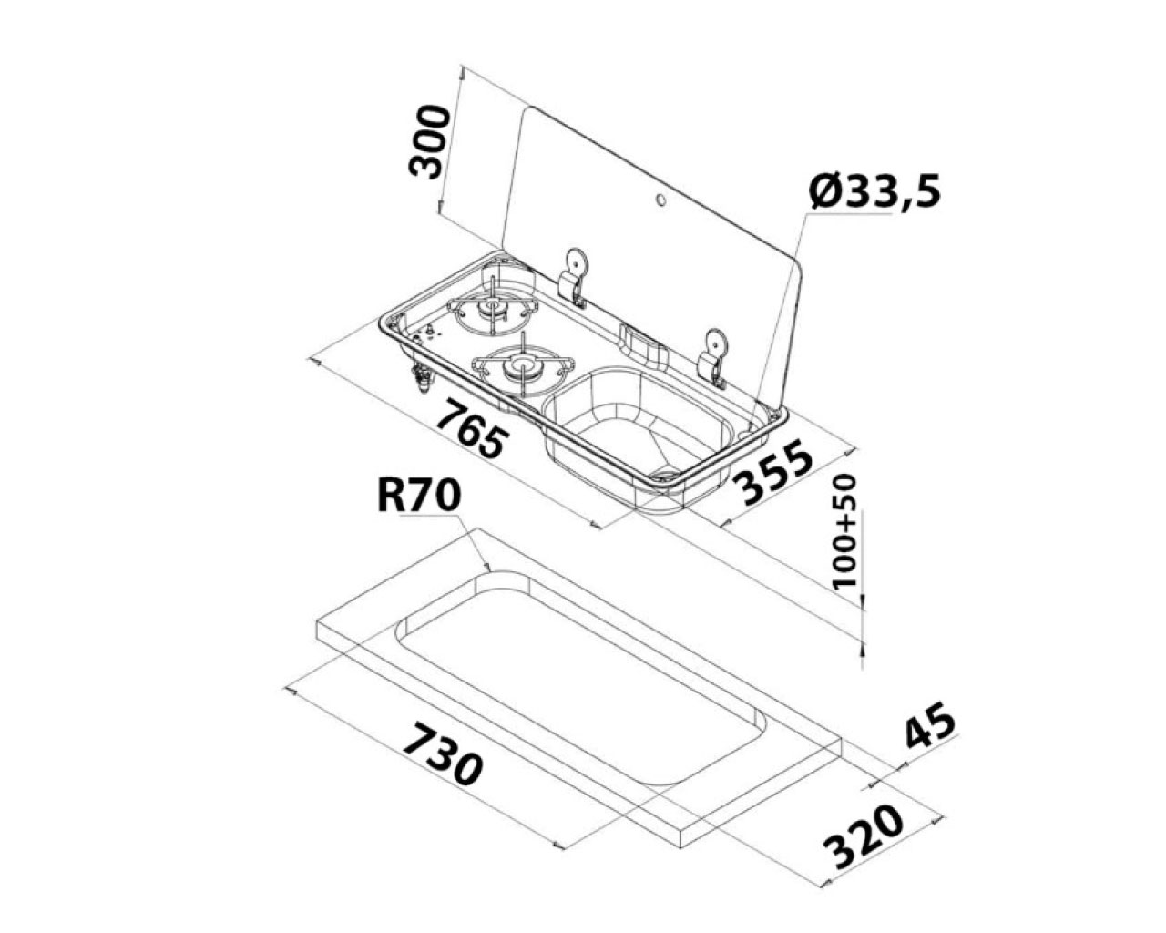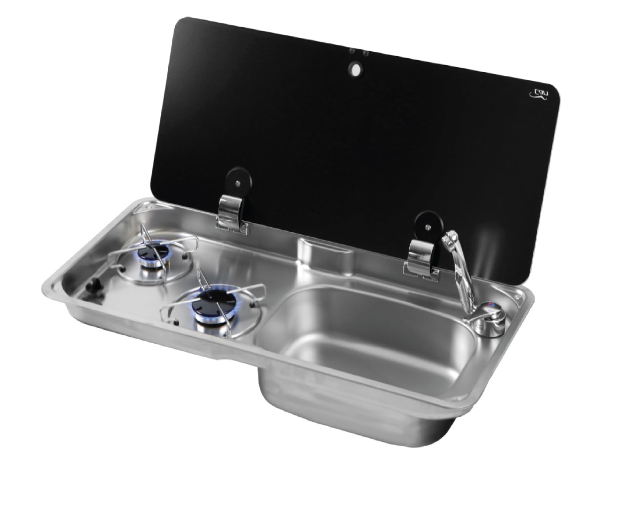 Štednjak s dva plamenika, sudoperom s desne strane, poklopcem od kaljenog stakla, antivibracijskim nosačem od nehrđajućeg čelika, piezomehaničkim paljenjem, termoelementom i dimenzijama 765x355x100+50 mm, isporučuje se bez slavine i odvoda, desna konfiguracija.