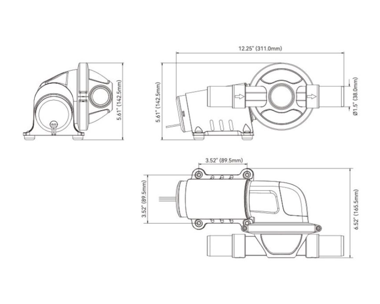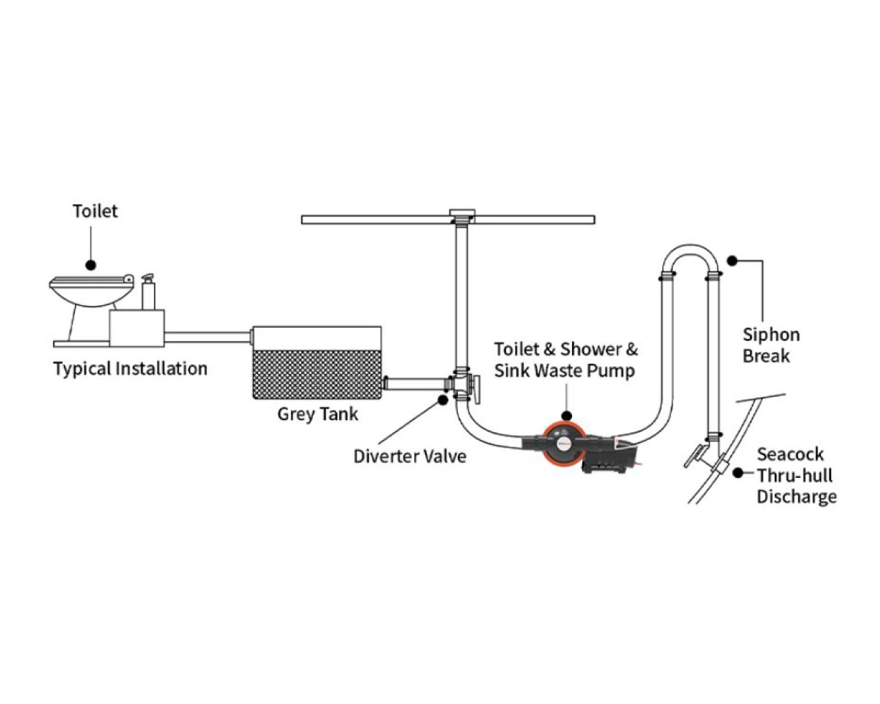 Jednomembranska pumpa za otpadne vode dizajnirana za rukovanje nerazrijeđenom crnom vodom iz WC-a i pumpom za odvod tuša i umivaonika. Samousisna pumpa može raditi na suho. Ventil bez prigušnice, nije potreban filter. Može pumpati mješavinu zraka i vode. Dvostruki izlazni ventili osiguravaju kontinuirani protok. Podesivi stezni prsten omogućuje okretanje glave za 360 stupnjeva radi prilagođavanja položaju vodovoda.